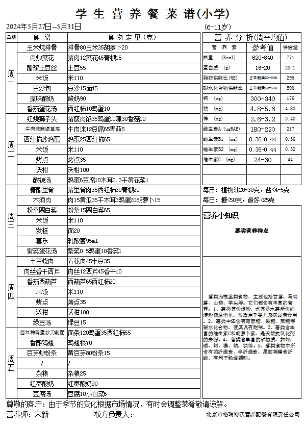 2024年5月27日-2024年5月31日学生营养餐菜谱(小学)