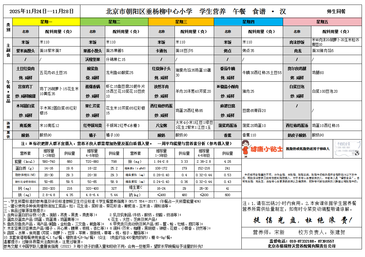 2025年11月24日-2025年11月28日学生营养餐菜谱(小学)