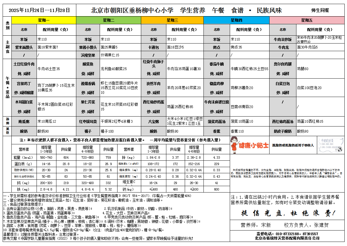 2025年11月24日-2025年11月28日学生营养餐菜谱(小学民族风味)