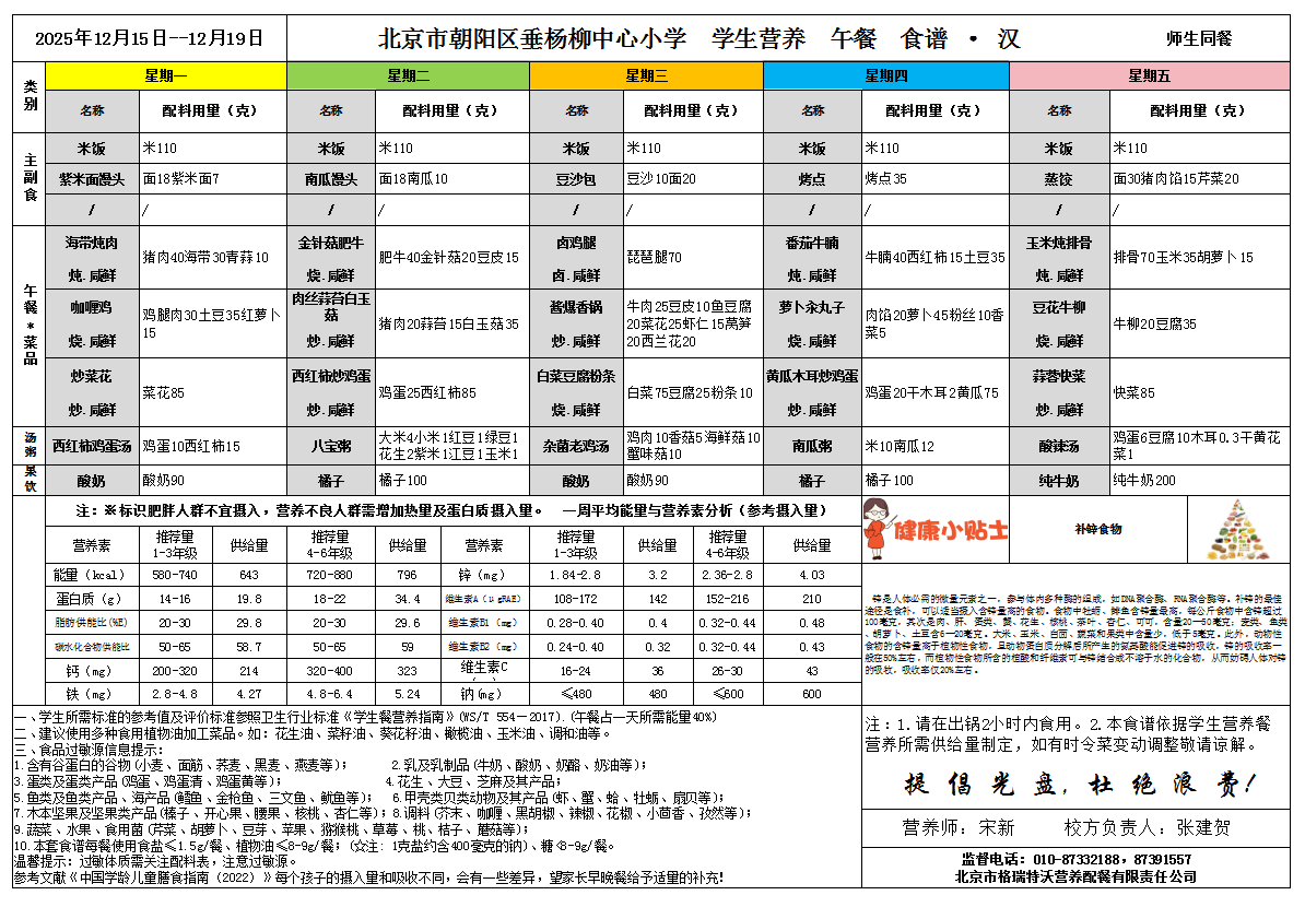 2025年12月15日-2025年12月19日学生营养餐菜谱(小学)