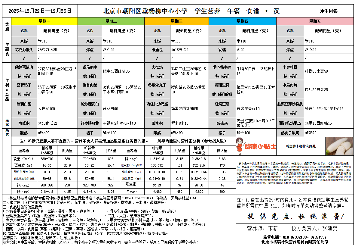 2025年12月22日-2025年12月26日学生营养餐菜谱(小学)