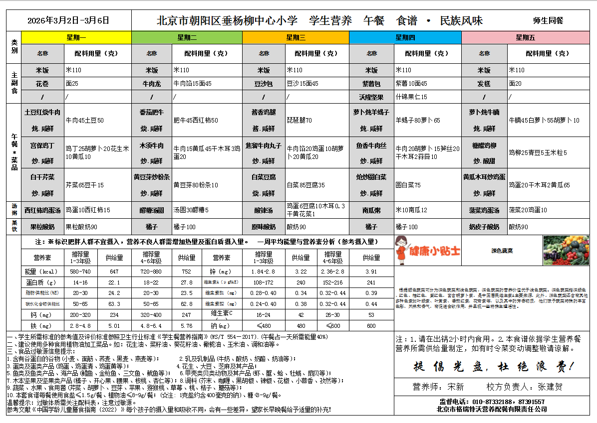2026年3月2日-2026年3月6日学生营养餐菜谱(小学民族风味)