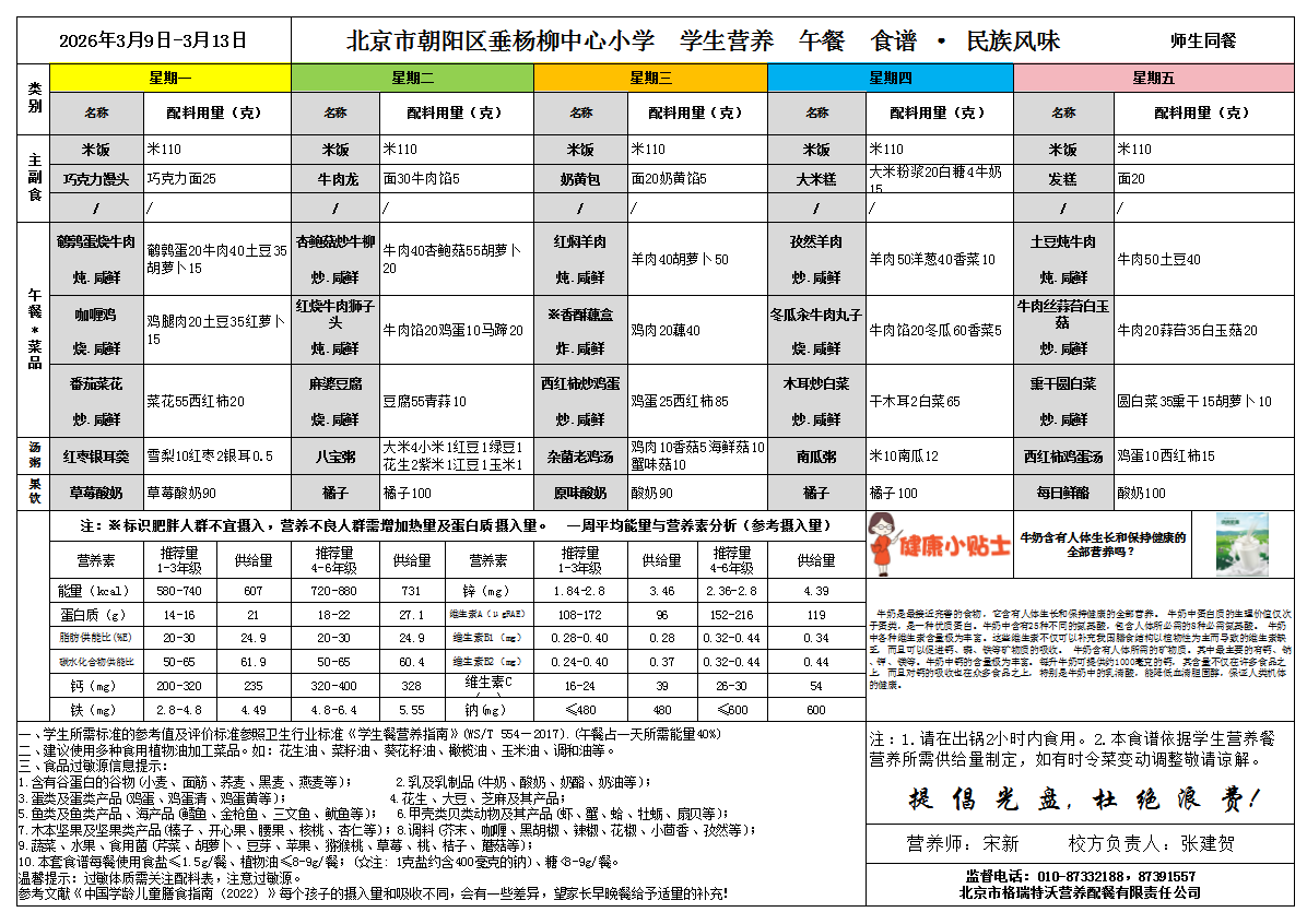 2026年3月9日-2026年3月13日学生营养餐菜谱(小学民族风味)