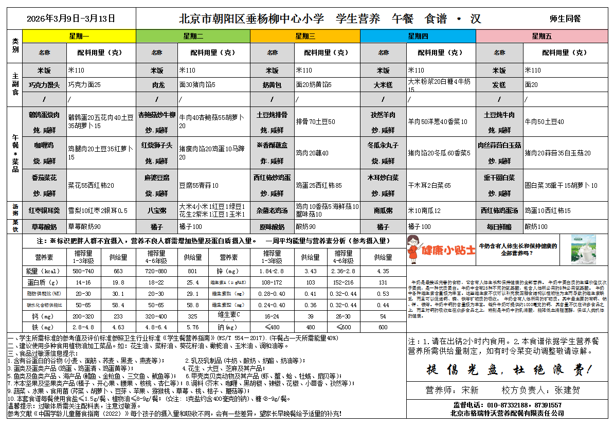 2026年3月9日-2026年3月13日学生营养餐菜谱(小学)