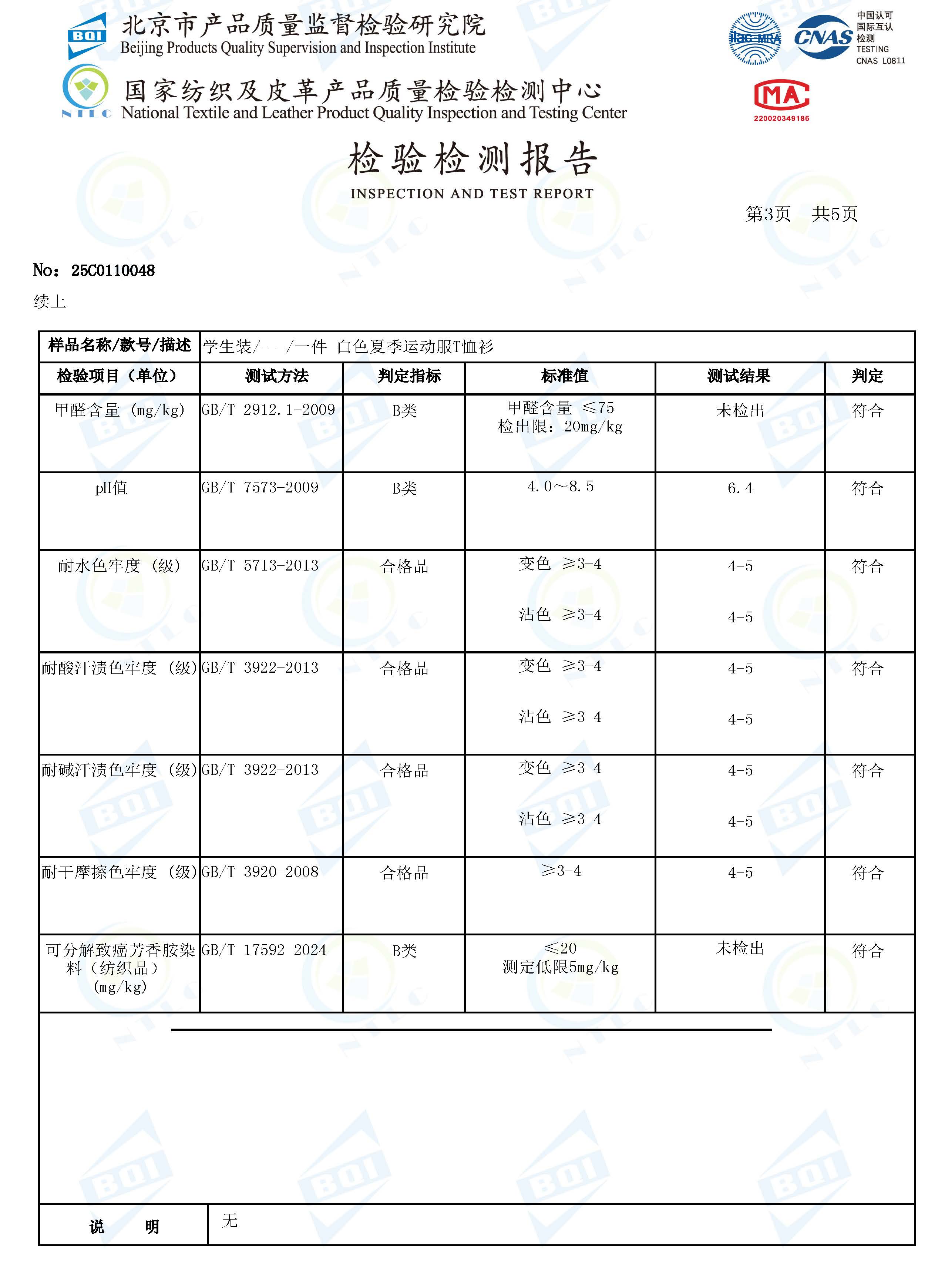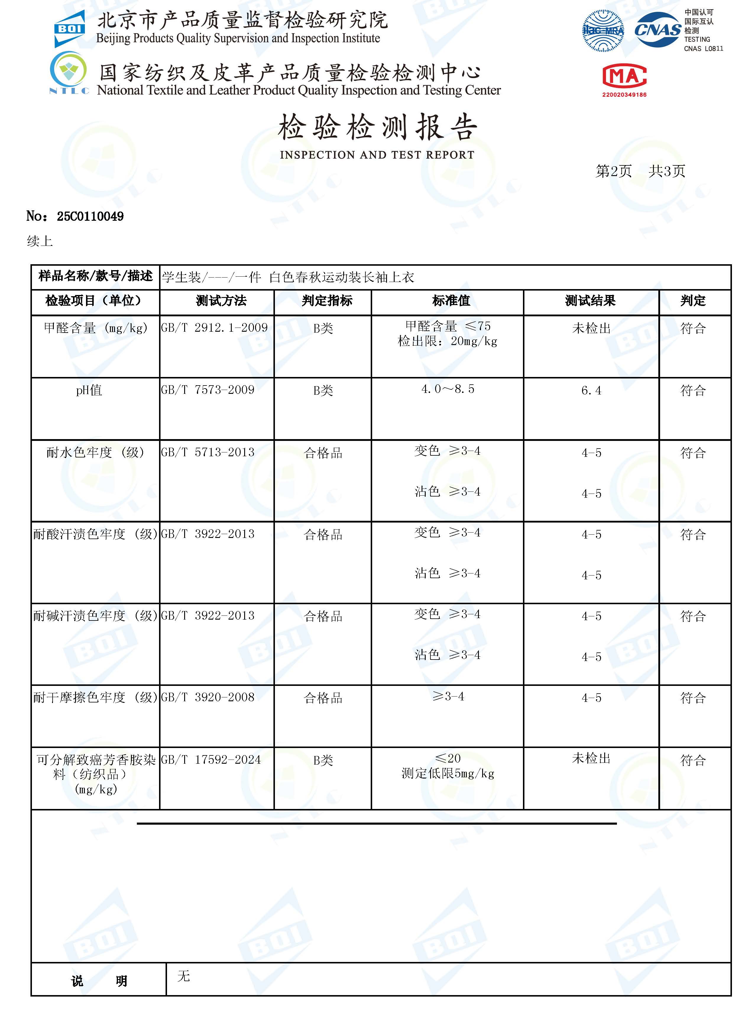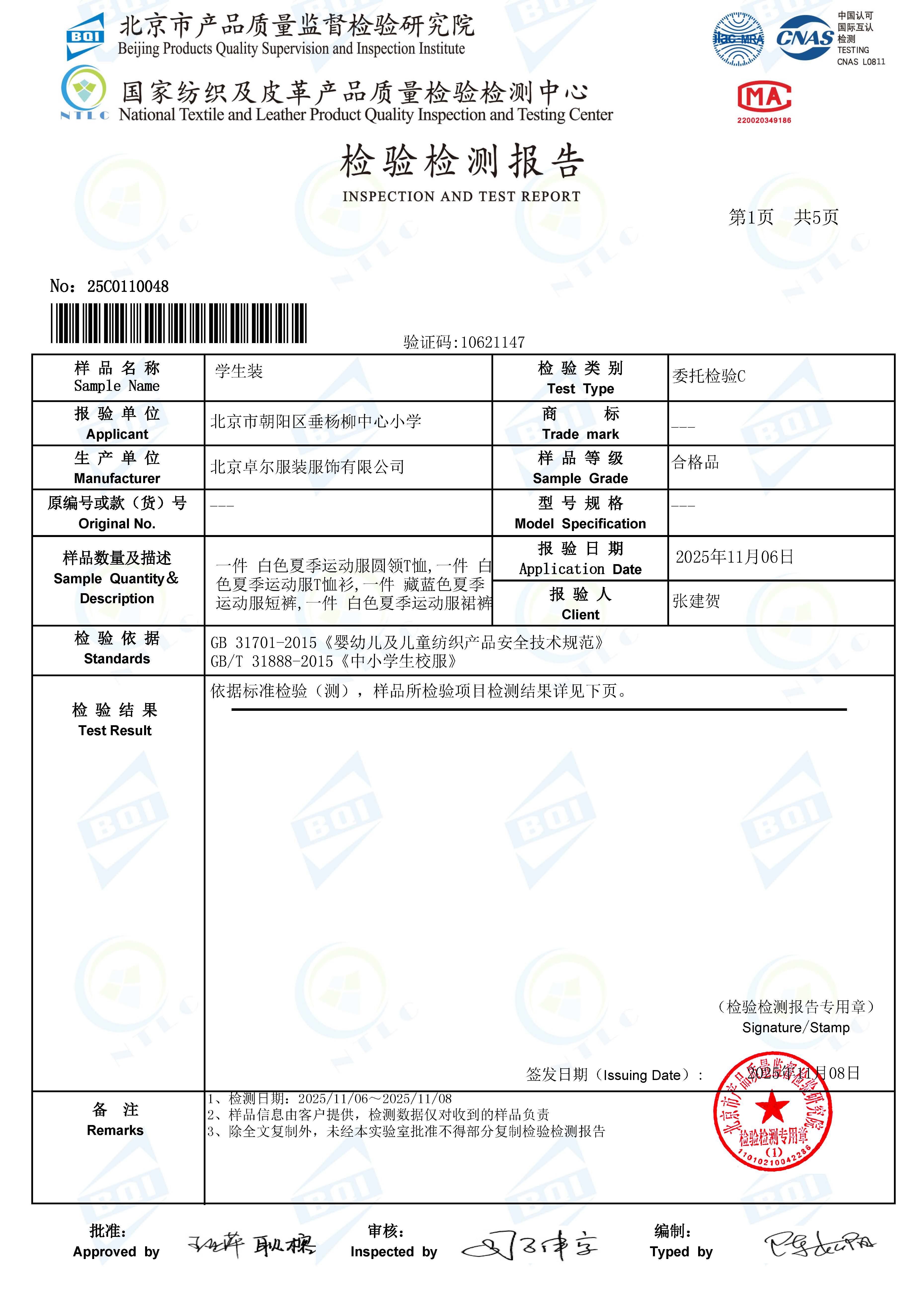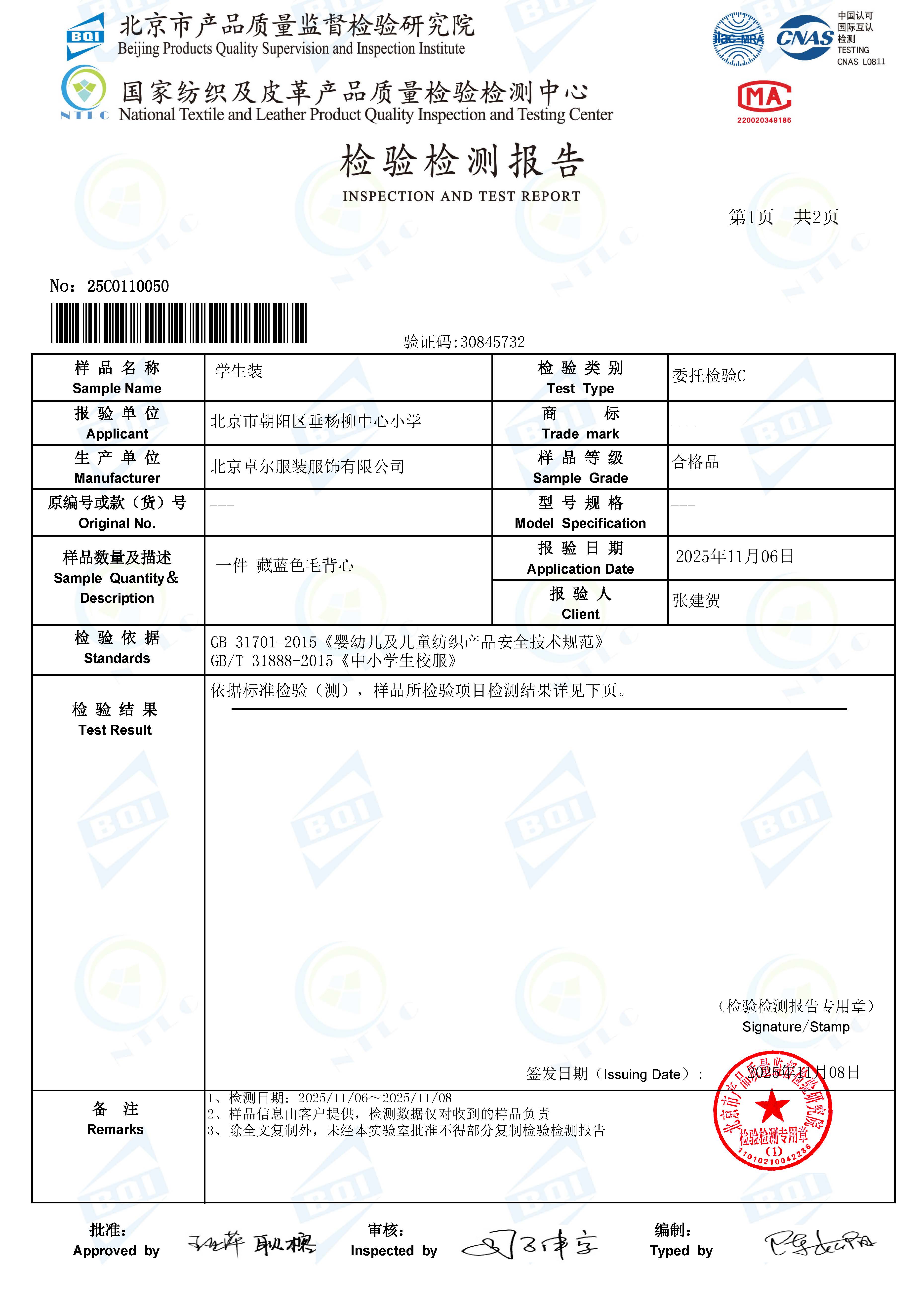 北京市朝阳区垂杨柳中心小学学生校服二次检测报告公示