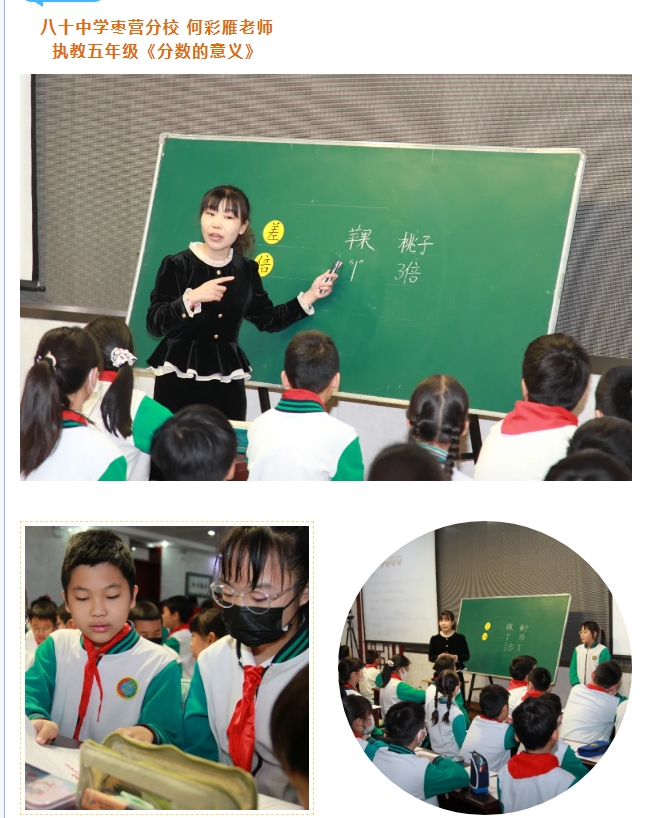 《义务教育数学课程标准(2022年版)》指出,要“改变过于注重以课时为单位的教学设计,推进单元整体教学设计,体现数学知识间的内在逻辑关系,以及学习内容与核心素养表现的关联”。基于对此的思考,我校和八十中学枣营分校构建“研究共同体”,基于“大单元”整体视角,共同探索《分数》大单元研究,此次活动两校分别呈现了1节《分数》单元课例。