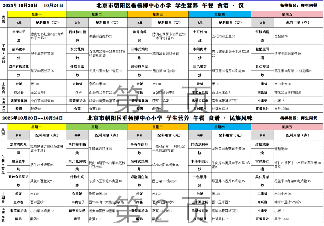垂杨柳中心小学杨柳校区2025年10月20日--2025年10月24日学生食谱