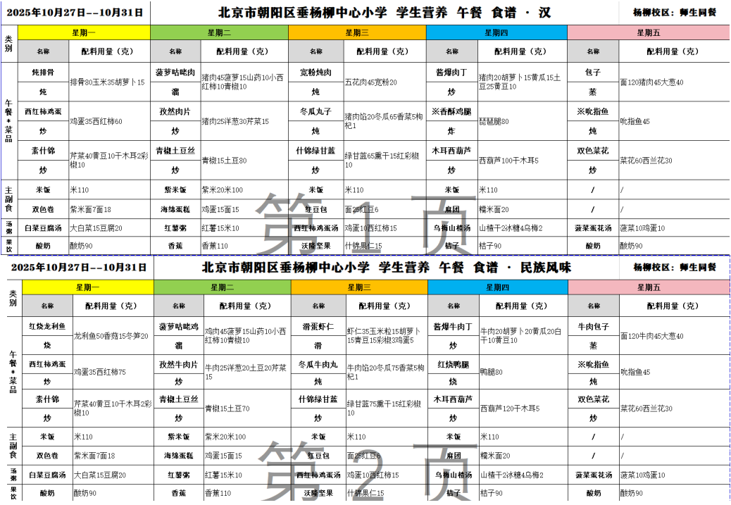 垂杨柳中心小学杨柳校区2025年10月27日--2025年10月31日学生食谱