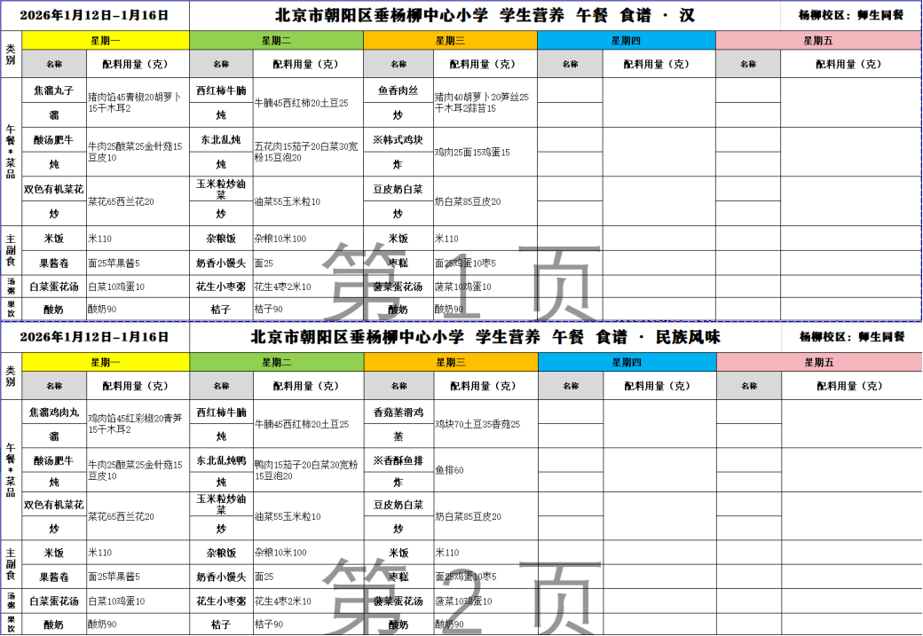 垂杨柳中心小学杨柳校区2026年1月12日--2026年1月16日学生食谱