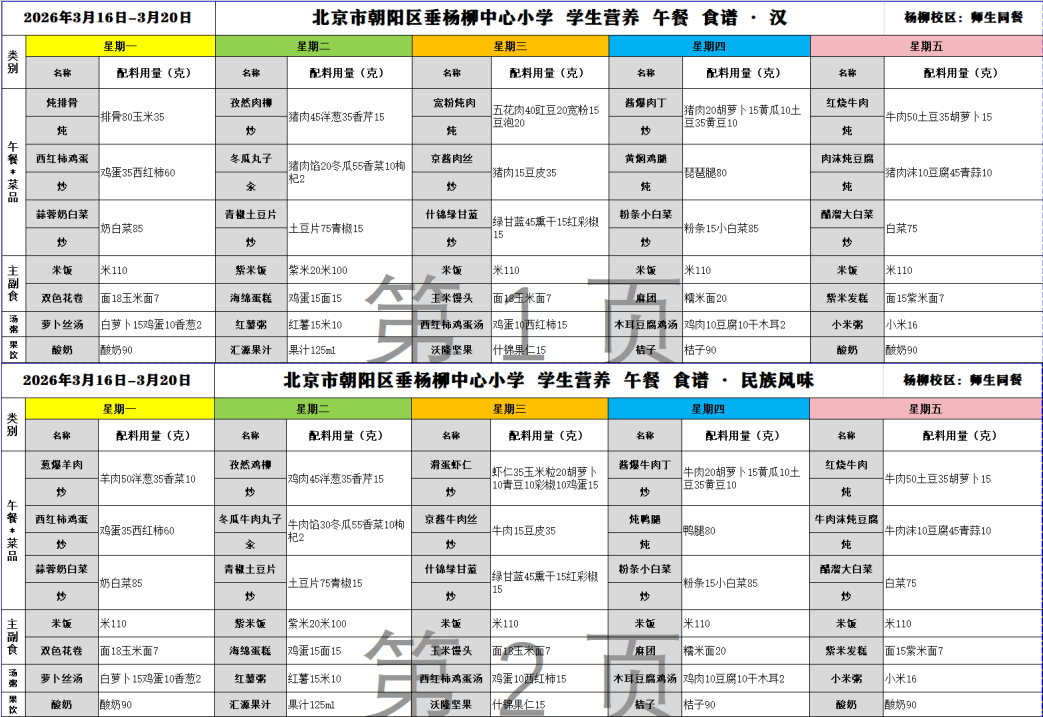 垂杨柳中心小学杨柳校区2026年3月16日--2026年3月20日学生食谱