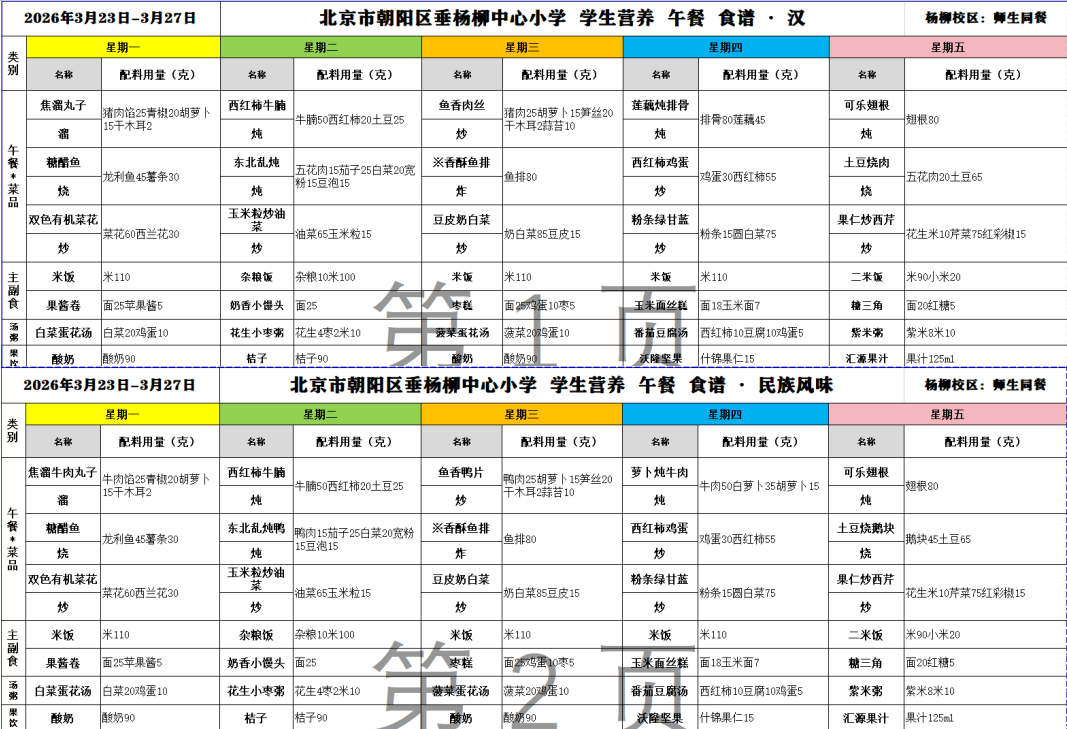 垂杨柳中心小学杨柳校区2026年3月23日--2026年3月27日学生食谱