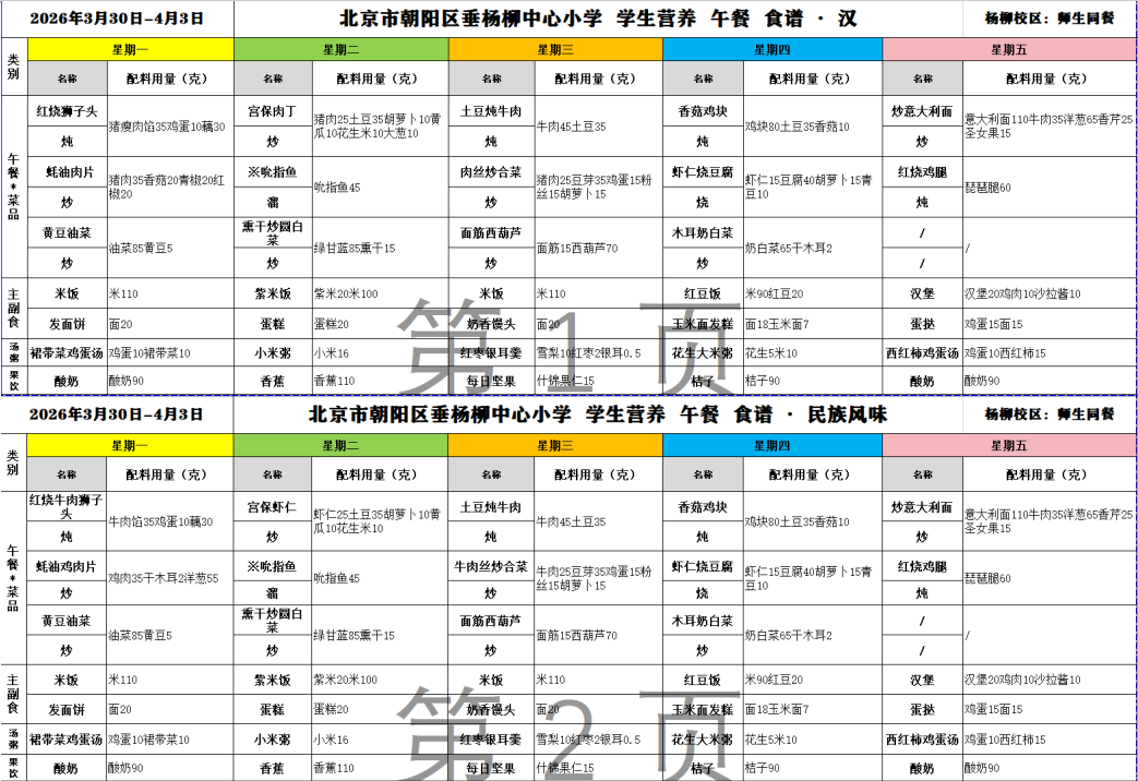 垂杨柳中心小学杨柳校区2026年3月30日--2026年4月30日学生食谱